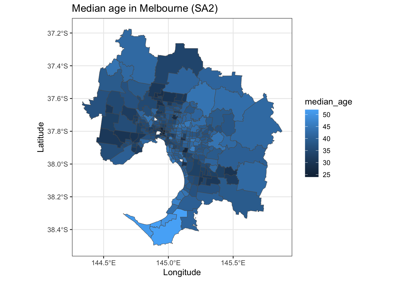 geom_sf(data = MEL_SA2_shp_census_2016, aes(fill = median_age, border = NA)) +