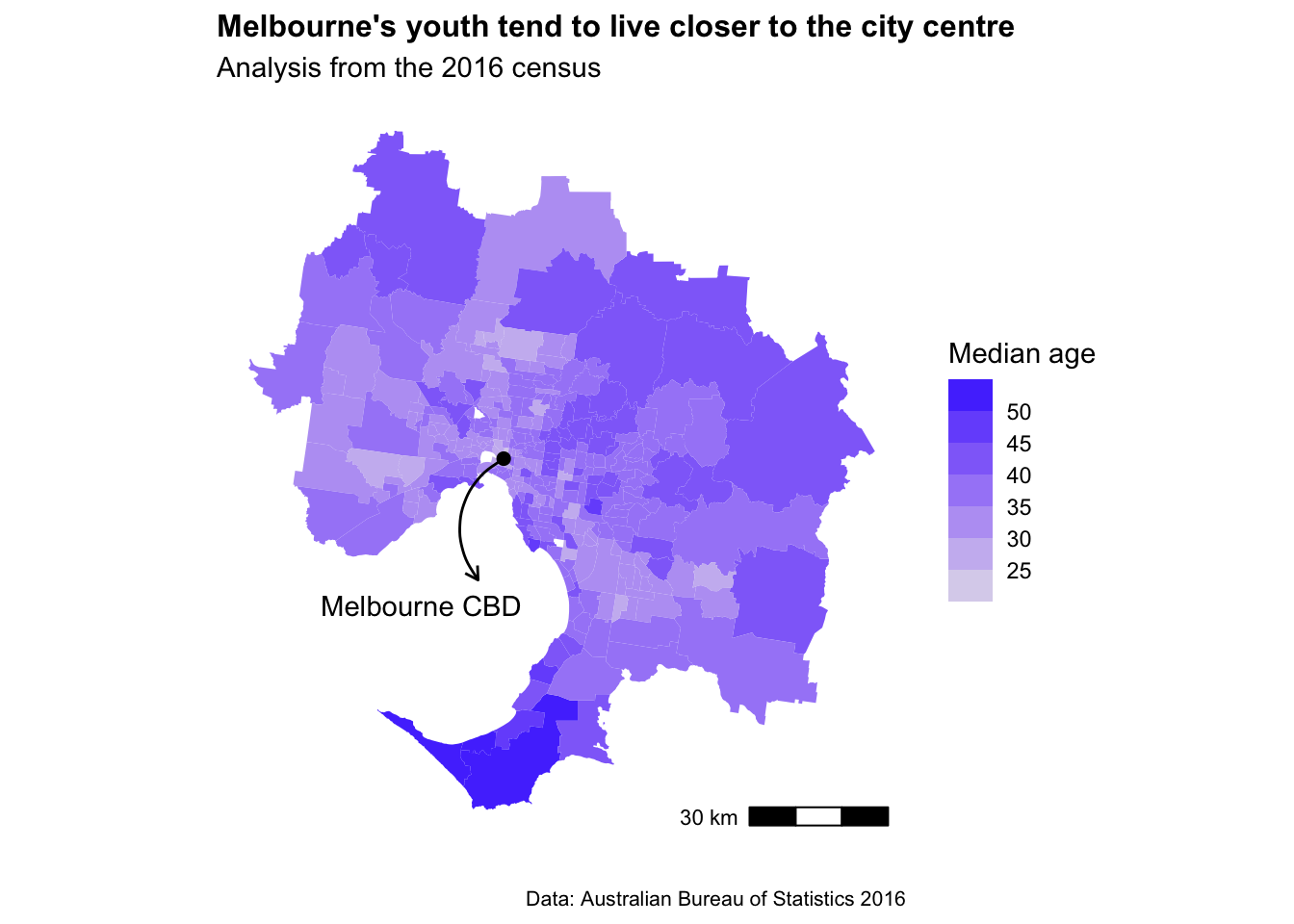 Let’s add a custom colour scheme, drop the boundary edges for the SA2’s, and add in a dot and label for Melbourne CBD.