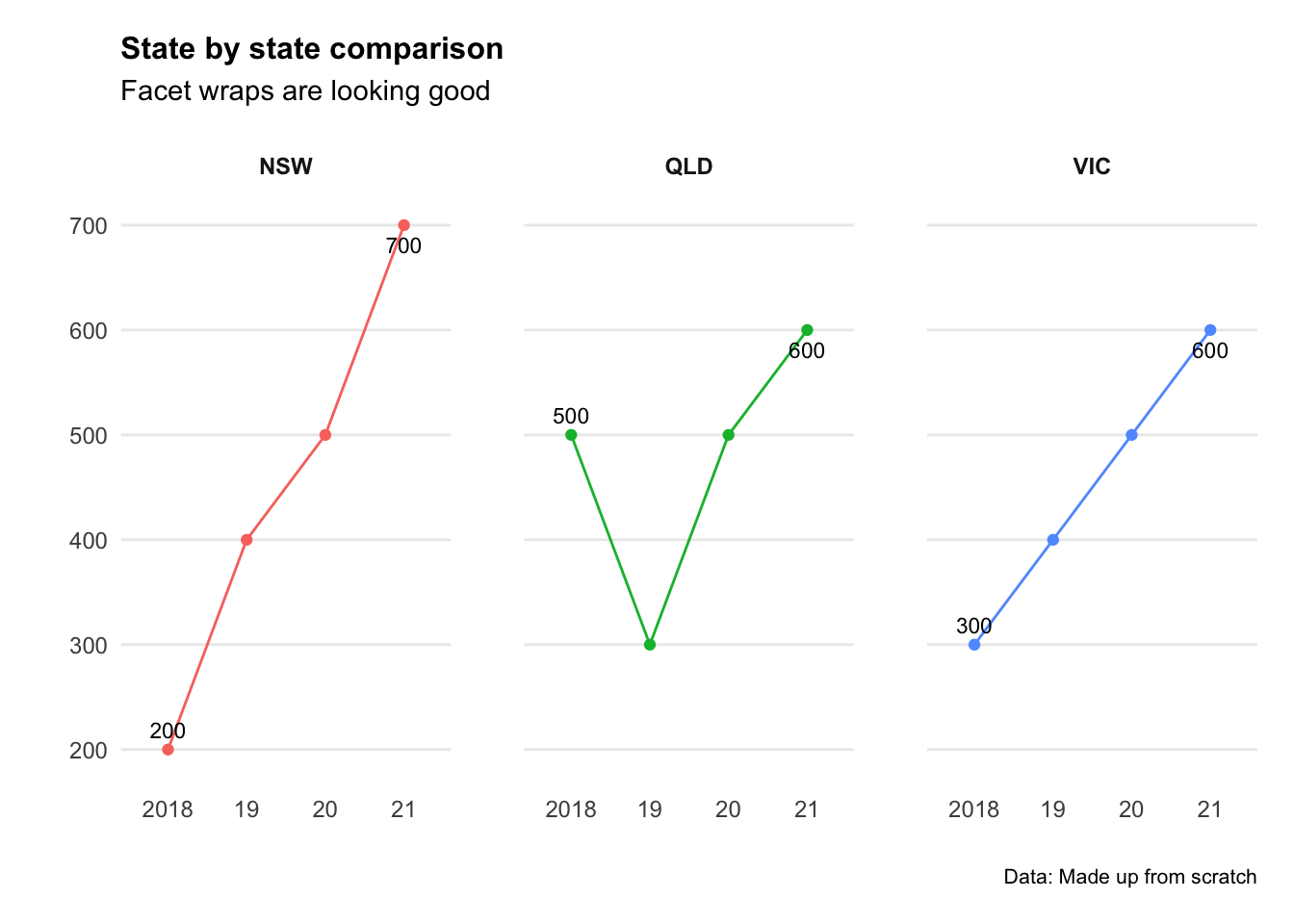 Before making a chart ensure the data is “tidy” - meaning there is a new row for every changed variable. It also doesn’t hurt to remove NA’s for consistency (particularly in time series).