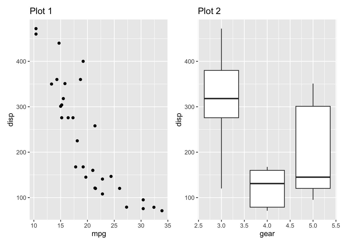 geom_boxplot(aes(gear, disp, group = gear)) +