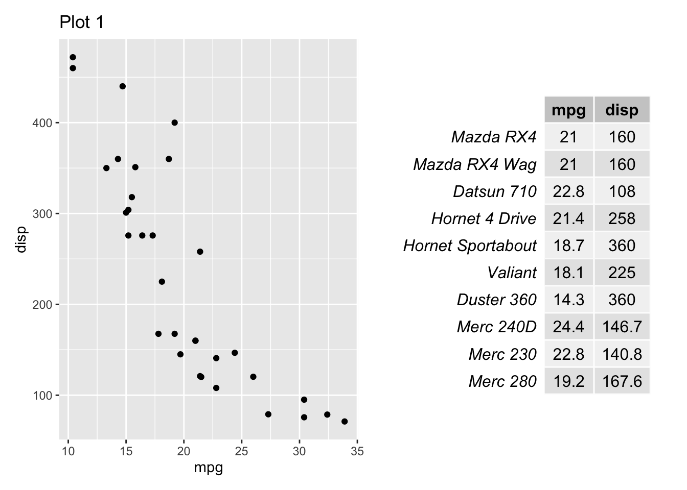 p1 + gridExtra::tableGrob(mtcars[1:10, c("mpg", "disp")])