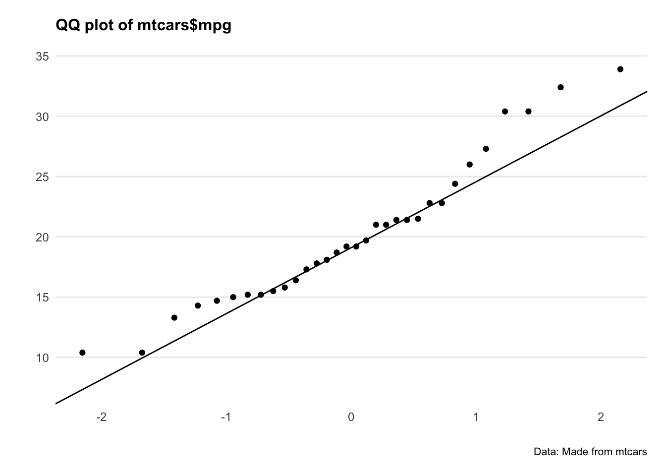 ggplot(mtcars, aes(sample = mpg)) +