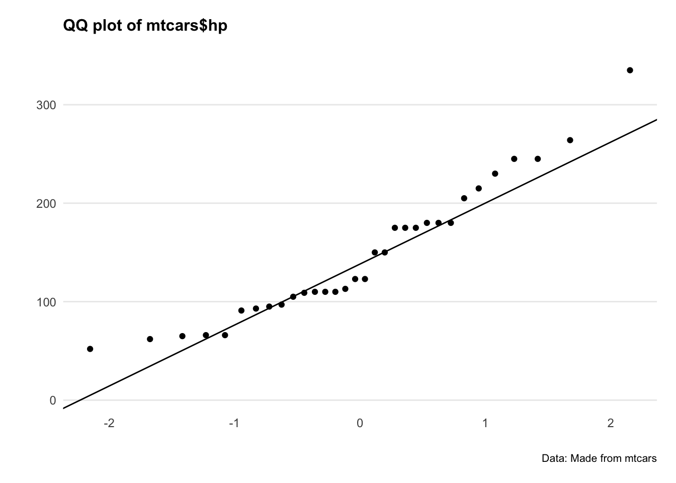 title = "QQ plot of mtcars$hp",
