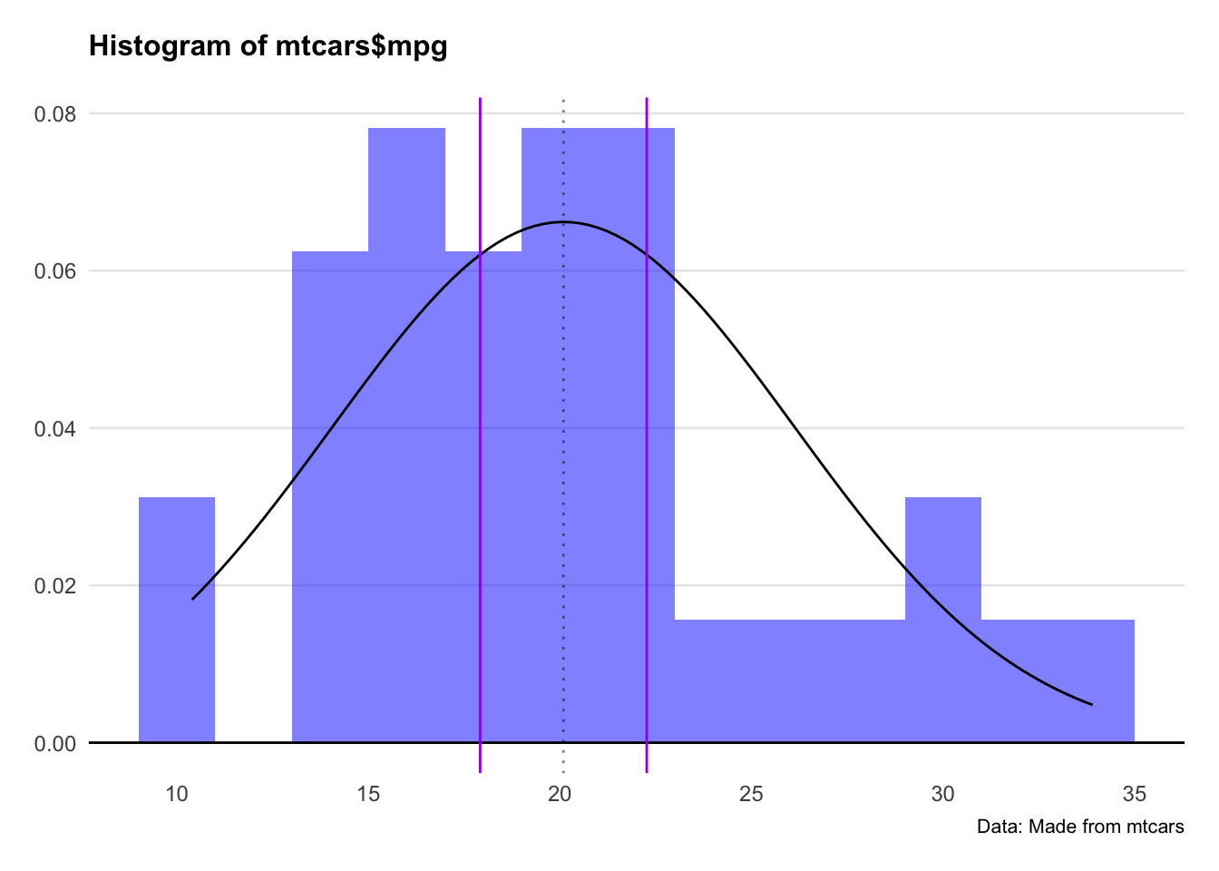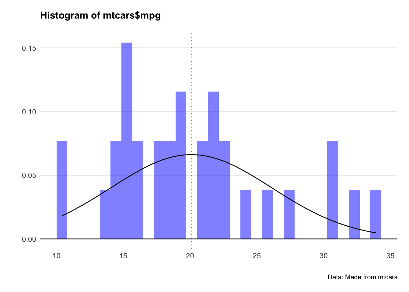 stat_function(fun = dnorm, args = list(mean = mean(mtcars$mpg), sd = sd(mtcars$mpg))) +