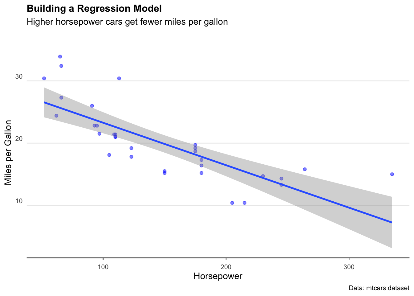 subtitle = "Higher horsepower cars get fewer miles per gallon",