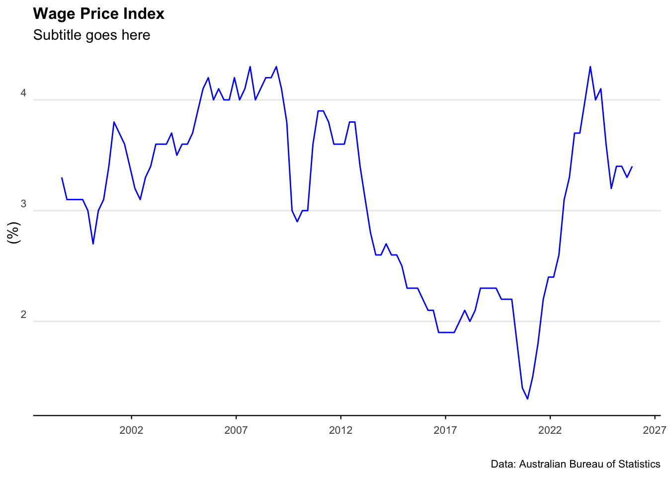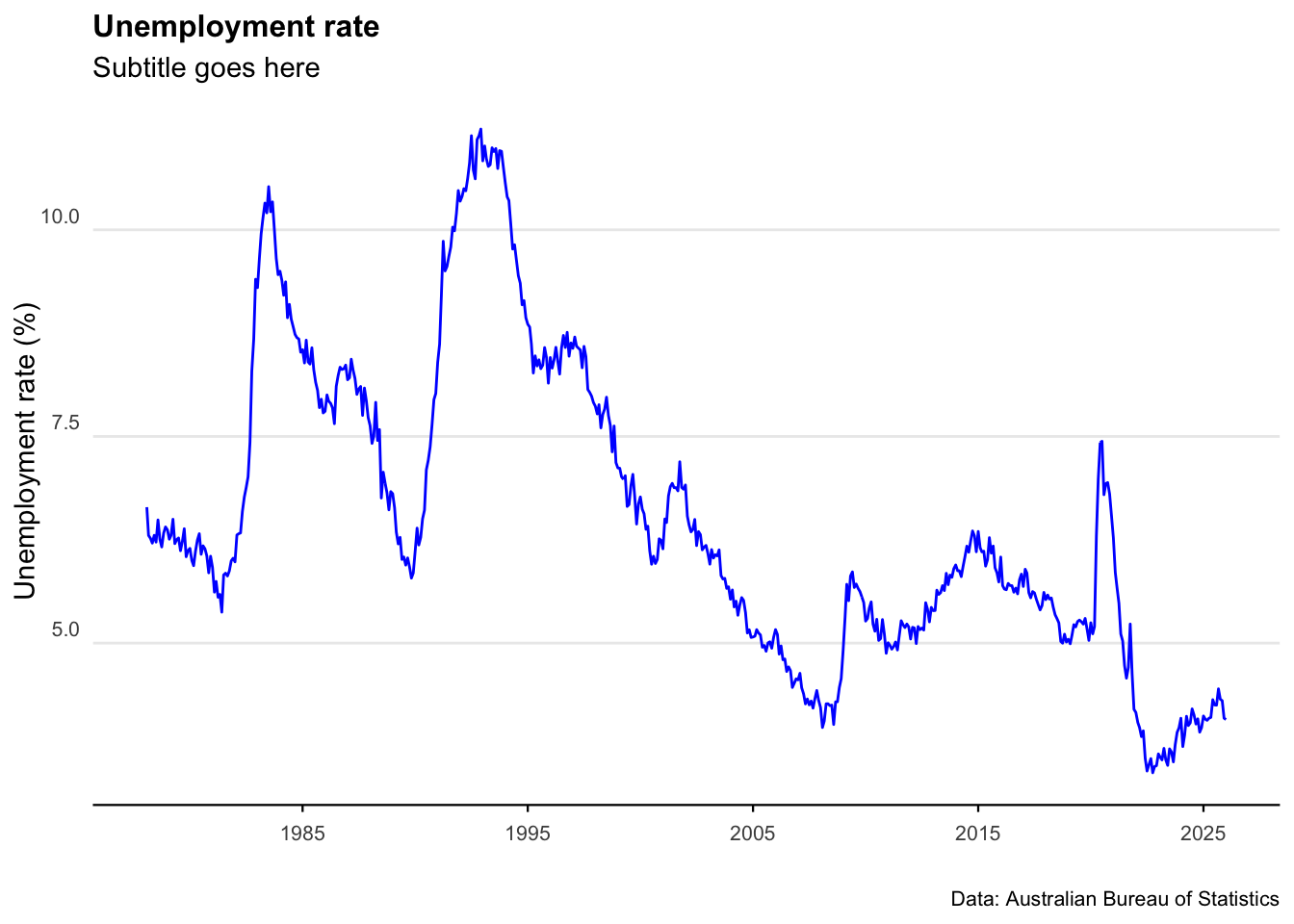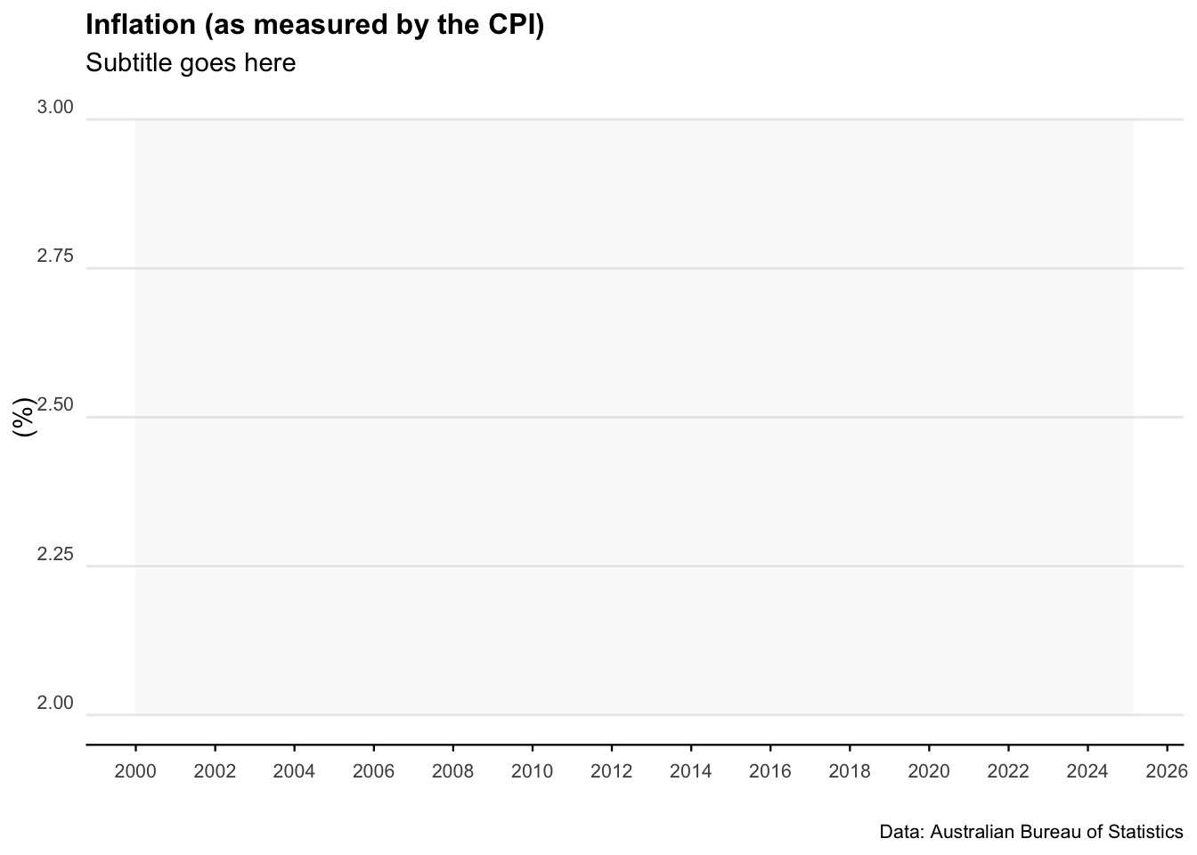 plot_CPI <-ggplot(data = Australia_CPI %>%filter(date >as.Date("2000-01-01"))) +geom_rect(aes(xmin =as.Date("2000-01-01"),xmax =as.Date("2025-03-01"),ymin =2,ymax =3 ),alpha =0.1, # Adjusted alpha for better visibilityfill ="lightgrey" ) +geom_line(aes(x = date, y = value), col ="blue") +scale_x_date(date_breaks ="2 years", date_labels ="%Y") +labs(title ="Inflation (as measured by the CPI)",subtitle ="Subtitle goes here",caption ="Data: Australian Bureau of Statistics",y ="(%)",x ="" ) +scale_y_continuous(labels = scales::comma) +theme_minimal() +theme(legend.position ="bottom") +theme(plot.title =element_text(face ="bold", size =12)) +theme(plot.subtitle =element_text(size =11)) +theme(plot.caption =element_text(size =8)) +theme(axis.text =element_text(size =8)) +theme(panel.grid.minor =element_blank()) +theme(panel.grid.major.x =element_blank()) +theme(axis.title.y =element_text(margin = ggplot2::margin(t =0, r =0, b =0, l =0))) +theme(axis.text.y =element_text(vjust =-0.5,margin = ggplot2::margin(l =20, r =-15) )) +theme(axis.line.x =element_line(colour ="black", size =0.4)) +theme(axis.ticks.x =element_line(colour ="black", size =0.4))plot_CPI