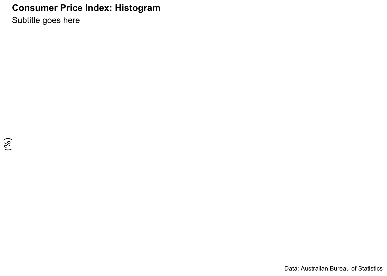 plot_CPI_hist <-ggplot(Australia_CPI, aes(x = value)) +geom_histogram(aes(y = ..density..),colour ="black", fill ="lightblue" ) +geom_density(alpha = .5, fill ="grey", colour ="darkblue") +scale_x_continuous(expand =c(0, 0)) +# Remove extra space on the x-axislabs(title ="Consumer Price Index: Histogram",subtitle ="Subtitle goes here",caption ="Data: Australian Bureau of Statistics",y ="(%)",x ="" ) +scale_y_continuous(labels = scales::percent, expand =c(0, 0)) +# Ensure no space on y-axistheme_minimal() +theme(legend.position ="bottom",plot.title =element_text(face ="bold", size =12),plot.subtitle =element_text(size =11, margin = ggplot2::margin(b =15)),plot.caption =element_text(size =8),axis.text =element_text(size =8),panel.grid.minor =element_blank(),panel.grid.major.x =element_blank(),axis.title.y =element_text(margin = ggplot2::margin(t =0, r =0, b =20, l =0)),axis.text.y =element_text(vjust =-0.5, margin = ggplot2::margin(l =20, r =-2)),axis.line.x =element_line(colour ="black", size =0.4),axis.ticks.x =element_line(colour ="black", size =0.4) )plot_CPI_hist
